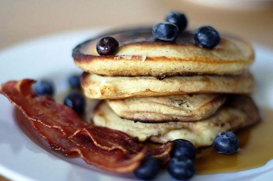 著名的美国早餐家庭烹饪的厚煎饼,搭上果汁和蓝莓,另外再放一些培根薄片。