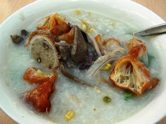 越南早餐包括一些粗面粉/麦片粥,上面撒有肉。图中的是猪肉粥,里面有中国甜甜圈,豆芽,用啦猪碎肉,猪心切片,猪胃切片和猪血糕填充的猪肉肠。比吐司和果酱要有趣一些。