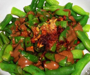 制法: 把豆角抽筋,折断,洗干净,在开水锅里焯熟,后用凉水浸泡,捞出控去水,放在调盘里。再把芝麻酱用冷开水调成糊状,把花椒油烧热,加入精盐、味精、姜末浇在豆角上,拌匀即可装盘。