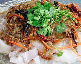 原料: 粉丝六两 白糖五分 酱油一两 辣椒油五钱醋三钱 花椒粉一钱 味精一分 制法: 先将粉丝用开水泡软,切成二寸长的段放盘内。用碗一只,放入酱油、醋、白糖、味精和冷开水五钱,调成卤汁,浇在粉丝上,撒上花椒粉,淋入辣椒油,拌匀即成。