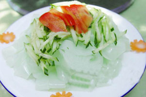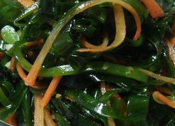 原料: 水海带一斤五两 精盐五钱 椒油五钱青菜三棵 醋三钱 葱丝一钱 姜三片 制法: 将海带洗净,切成细丝,放在开水中焯一下捞出控干,撒上精盐、青菜丝拌匀盛盘,最后放上葱、姜,倒上醋,椒油加热炝上即成。