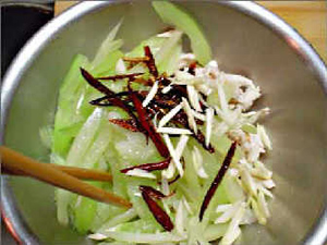 制法: 将莴笋剥去皮洗净,直刀切成丝;黄瓜洗净切丝;辣椒也切成丝。撒上精盐、醋拌匀,放上葱、姜,炝上椒油即成。
