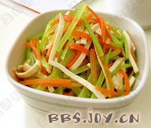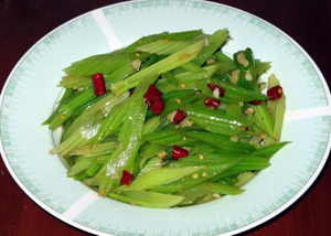 制法: 将芹菜摘叶拣净,削去毛根,洗净。切成五分长节,入开水锅里焯一下,之后撒上精盐拌匀,食用时浇上酱油、特醋、香油,也可浇入花椒油其味更长。醋不可早放,否则菜会变黄。