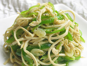 制法: 先将青椒去柄洗净,用直刀切成细丝;香腐干也用直刀切成细丝,一同放入开水锅里焯一下捞出,沥去水后倒入调盆里,加入香油、白糖、精盐、味精拌和均匀即可装盘。
