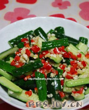 原料: 鲜嫩黄瓜二斤 红辣椒四个 精盐五钱椒油五钱 酱油一钱 葱一钱 姜三片 白糖二钱 陈醋三钱