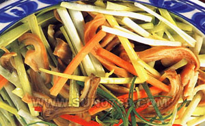 2.将冬菇、笋、香干切成细丝,放开水锅中烫一下捞起,沥水后撒在芹菜上,再加入姜末、白糖、精盐拌匀,浇上芝麻油即成。