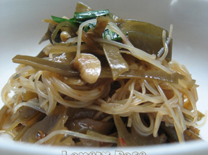 制法: 将海带洗净沙,直刀切成细丝,入开水汆透捞出;水粉丝推切成五寸段,青菜叶洗净直刀切细丝。把三种菜料和入调盆内,然后将酱油、醋、精盐、味精、姜末、葱花、蒜泥、香油依次调入,搅拌均匀,装盘上桌即可。