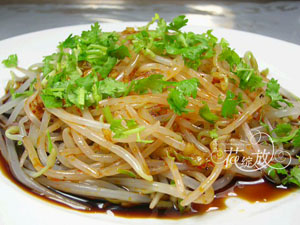 制法: 将绿豆芽拣好洗净,放入开水中汆一下,捞出控干,撒上盐、醋、青菜叶拌匀盛盘。最末放上葱、姜、芫荽,炝上椒油即可。