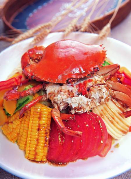 原料:膏蟹1只350克,生菜300克,彩椒、洋葱各10克,玉米100克,苹果、香瓜各100克,西红柿180克,水蜜桃80克