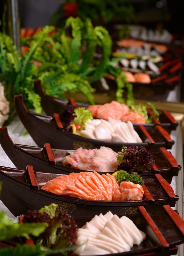 相比北上广深港澳台各大五星级酒店自助餐的“高大上”,成都e香格里拉的自助餐在价位上明显要亲民许多,中午只需188元一人,时间为12:00至2.30;而晚上也仅需288元一人(都需另加15%服务费)。虽然价位亲民,但是品质依然一流,种类丰富,中西结合,几乎你能想到的,这里都有!