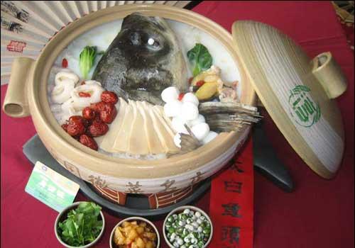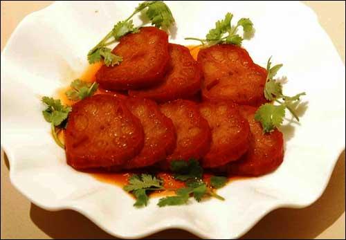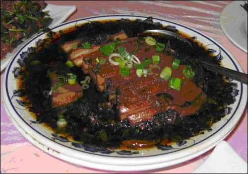 点评:咸字当头、山货为主、村气十足。徽菜的“咸”与川湘菜的“辣”异曲同工,都是想让一盘菜可以节约吃上好几天。区别在于咸是让菜慢点变坏,辣是在菜坏后弥补,二者都是小气特性。徽菜擅长“烧”工,无论什么菜都象是用乡下烧柴大铁锅拔拉出来的,柴火味过重,干瘪无水,咸得出奇,再怎么弄也是农家菜味道,上不得大台面。