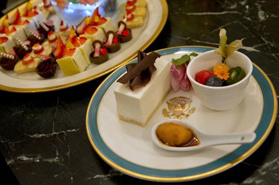 美式芝士蛋糕 各款精美菜式均用上白宫新制的蓝色11套头国宴瓷器盛载,它们均由白宫室内设计师史密斯征询第一夫人米歇尔意见后制成。据称,这套为320人的宴席准备的瓷器,共花费约36.7万美元,由白宫历史协会的一个私人基金支付。