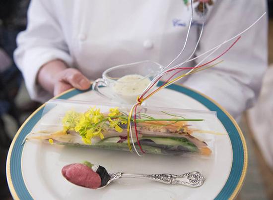 头盘是美日融合菜式鞑靼吞拿鱼腩及西泽刺身沙拉 报道称,头盘是美日融合菜式鞑靼吞拿鱼腩及西泽刺身沙拉,由日本美食节目《铁人料理》知名大厨森本正治负责,沙拉以透明醋酸人造纤维包裹,再用日本特色“水引”绑住,如一件礼物等待宾客打开。