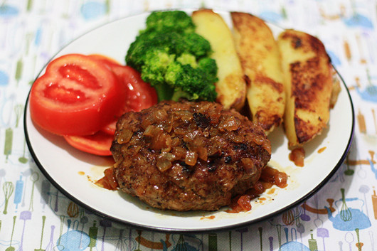 绞碎了的牛肉和猪肉,掺入被牛奶浸泡过的日式面包粉和洋葱,再配以番茄酱与辣酱油,这就是典型的日式肉丸(hanbāgu)的做法。