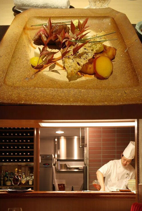 在这家餐厅的外面,食客们往往只能看到极简的室内设计,完整的落地窗和烟雾缭绕的窗外风景。其实,餐厅里头卖的却是有点不搭的法国料理,虽然听说这间分店比法国本店的价格还贵,但是对于我们来说,日本还是好到达一些啊。