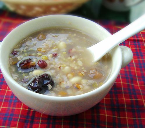 八种配料:大米、糯米、小米、黄豆、绿豆、红豆、红枣、桂圆。