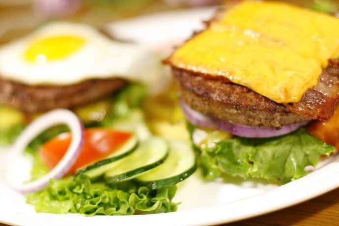 由炸肉饼,洋葱,酸辣酱等做成的汉堡包或热狗面包。