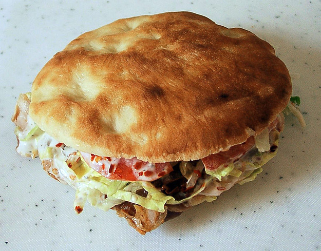 从肉叉上切下一片烤肉,包在皮塔饼中,配上任意的其它配料如西红柿、洋葱、生菜叶、腌黄瓜和辣椒。从酒吧出来的醉鬼们总喜欢在回家路上来一份。就该这么吃。