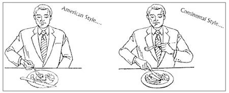 欧美刀叉用法的区别:美国人切下食物后,刀刃朝内,在食盘的上半部放下刀具,换右手以握笔的手势拿叉进食,此时叉齿朝上——欧洲人认为这样频繁换手略显粗野。
