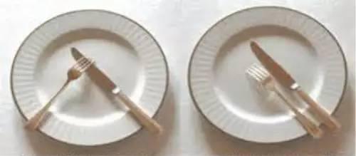 当完全停止进餐时(如图右):将刀叉并排放于食盘中间,或者朝向时钟10:20的方向放置,刀刃朝内,叉齿朝下。
