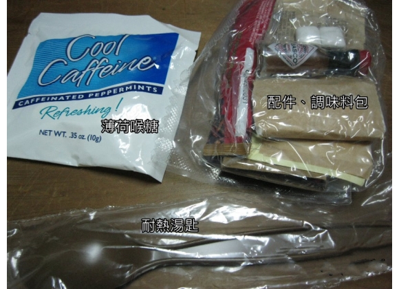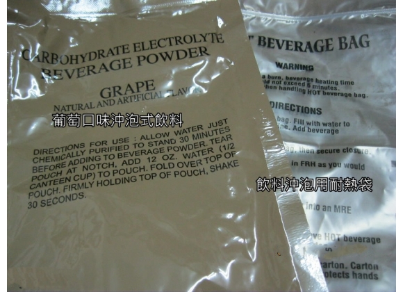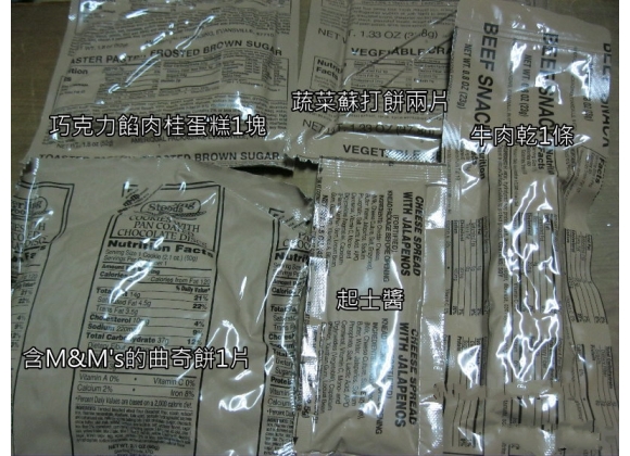 这里必须要吐槽一下,这三样食品让美国大兵们闻风丧胆,巧克力馅肉桂蛋糕完全没有巧克力味,一拿就松,一吃就散,完全不知道巧克力味在哪;蔬菜苏打饼既不咸,也不甜,上面可以的绿色蔬菜吃起来一股塑料味,它的存在仅仅是为补充士兵的碳水化合物。M&M曲奇饼让你简直不敢相信这是由生产了风靡世界的M&M豆的Mars公司生产的,整块曲奇硬如钢铁,能吃下去饼消化点简直是一个奇迹。