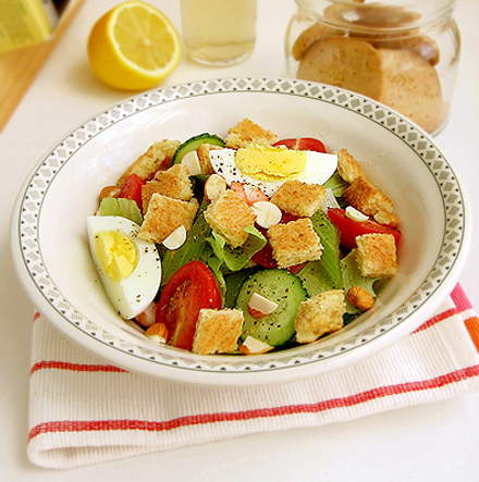 5.取一个大碗,放入撕碎的生菜叶、小西红柿、黄瓜片、切好的鸡蛋、芹菜段、虾丁,加一点点盐、现磨的黑胡椒碎、橄榄油、最后挤上半个柠檬汁,拌匀后撒上烤好的蒜香吐司丁,再撒上一些小杏仁碎,就可以吃了。