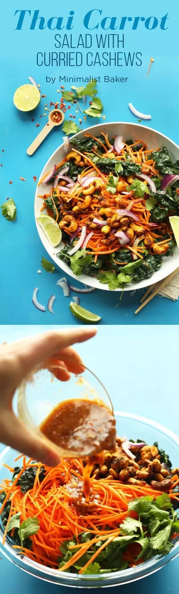 你可以用刨丝器把胡萝卜刨得很细,或者曼陀铃。这道菜只有428卡,尝尝咖喱味的腰果有什么不同吧。