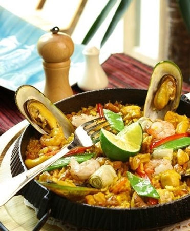 西班牙海洋渔业资源十分丰富,海鲜常作为国宴的美味佳肴。“巴爱雅(Paella)”举世闻名,它实际是一种用油炒过的大米加上各种海鲜或肉食作配料制作而成,政府高官常用此招待外国贵宾。