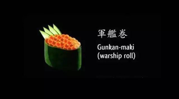 2cm高的饭团配上3cm高的海苔,绕上一圈,在凹陷处填入食材,即成军舰卷。一般军舰卷多用于承装鱼子等容易散落的食材。