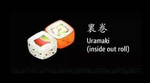 里卷是使用海苔来包裹配料,米饭露在外层,裹着最中心的食材。最初是为不习惯吃生鱼贝类和外面包裹海苔这种感觉的外国人设计的,所以便将米饭反过来包裹住海苔和其他食材,最外层还可点缀芝麻、鱼籽、蟹籽等。