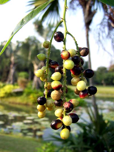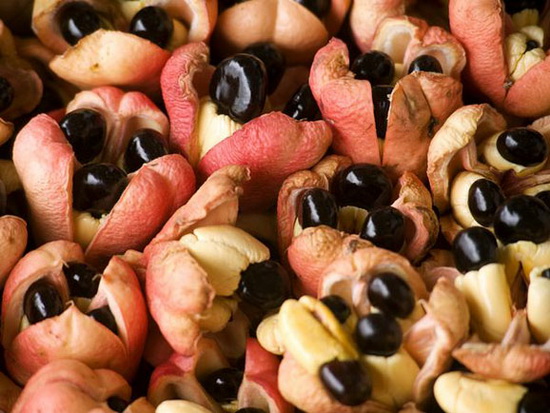 西非荔枝果,是牙买加的国果。荔枝果的果壳在阳光照射下裂开,露出3个分别连着柔软的奶黄色果肉的黑色大种子。成熟的荔枝果美味又营养,但没有裂开的果肉中含有有毒的次甘氨酸,食用要相对谨慎一些。荔枝果干燥的种子、果实、树皮和叶子都有药用价值,因此受到当地人的欢迎。