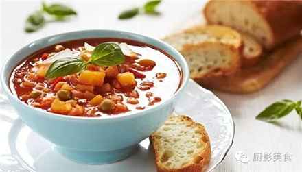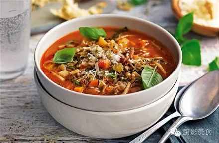 意大利民族是一个崇尚美食的民族,在饮食方面有着悠久的历史。意大利蔬菜汤是一道西式风味餐汤,主要以洋葱、番茄为主要原材料,汤浓而清香,朴素而淡雅。