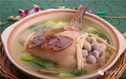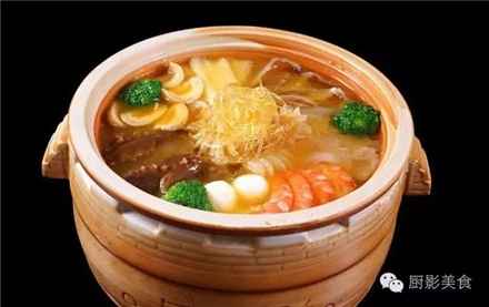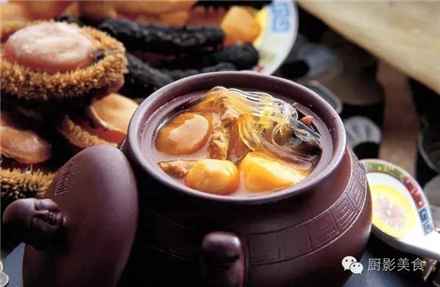 佛跳墙这道菜,即是采用十八种主料、十二种辅料互为融合,包括鱼翅、海参、鲍鱼、干贝、瑶柱、花胶、鸡鸭、猪肚、蹄筋、火腿、鸽蛋、香菇、竹笋等三十多种原料,分别处理干净后装入坛中。佛跳墙之煨器,多年来一直选用绍兴酒坛,坛中有绍兴名酒与料调合。感谢你的阅读,我们的微信号是厨影美食,请加关注哦!更多精彩内容请关注微信公众号“厨影美食”。装坛后以荷叶密封坛口,以无烟炭火微火煨五六个小时而成。此菜讲究储香保味,煨制时几乎没有一丝香味溢出,在煨成开坛之时,只需略略掀开荷叶,便觉浓香扑鼻,沁人心脾。将汤盛在碗中,浓厚而不腻,软烂而不腐,各种食材的味道并未因一罐炖制而混杂,各种风味,都能一一辨别。