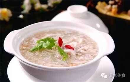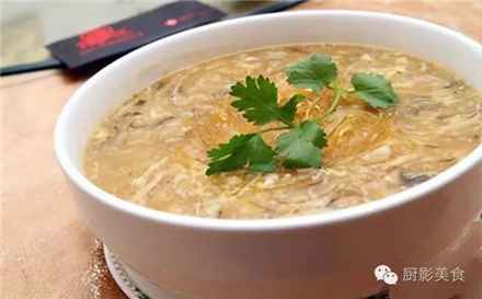 宋嫂鱼羹是浙江杭州地区的一道名菜,创制于南宋淳熙年间,现代诗人、作家俞平伯在《略谈杭州北京的饮食》中所指出:“西湖鱼羹之美,口碑流传已千载矣。”其具体做法是将鳜鱼或鲈鱼蒸熟后剔去皮骨,加上火腿丝、香菇、竹笋末、鸡汤等佐料烹制而成,成菜油润鲜香,酸爽开胃,似有蟹肉的鲜味,食用者吃过以后无不赞赏。