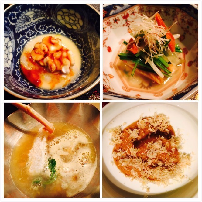 主厨对于食物本身的味道比较“处女座”,所以在摆盘上并没有那么care,但服务保持在了日本米其林餐厅的高水准,进店之后坐下,打完招呼点完酒,前菜一次上齐,然后依次是煮物、刺身、主菜、炸物、冷钵、主食。