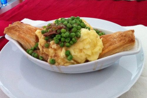 常被人们誉为完美的解酒食物——Piefloater,是一种澳式肉饼。它往往被置于浓郁的绿豆汤上一起食用。有时也会在其上洒上番茄酱,醋,盐以及胡椒。