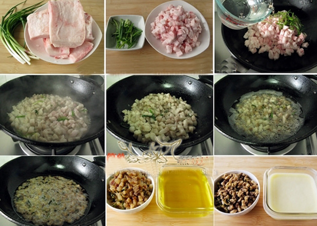 1 猪肥膘洗净切小丁,葱切段;