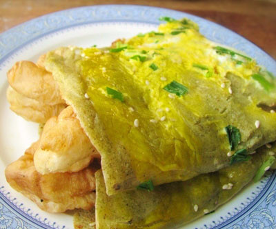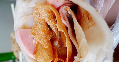 煎饼果子:与其它地区煎饼不同之处在于传统的做法原料是用绿豆杂粮面摊制而成的,而那特有的大果子(油条)也是必备的一物,在我们看来油条不单吃,放在煎饼里不是很奇怪吗?但正是这种特色吃法不仅风味别具,也成为了天津煎饼果子的一大特点。