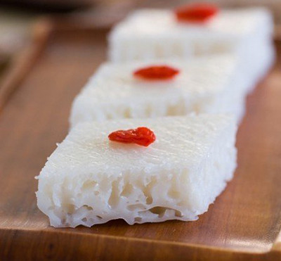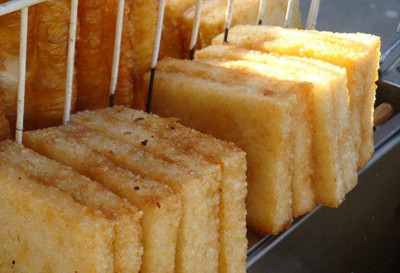 熨斗糕:做法是:在米粉浆中加入鸡蛋、白糖、蜜桂花等,然后装入*河蟹*的烙碗内翻烙至金黄色而成。烙好的熨斗糕有良好的松硬度,外酥呈棕黄色,里面松软香甜。