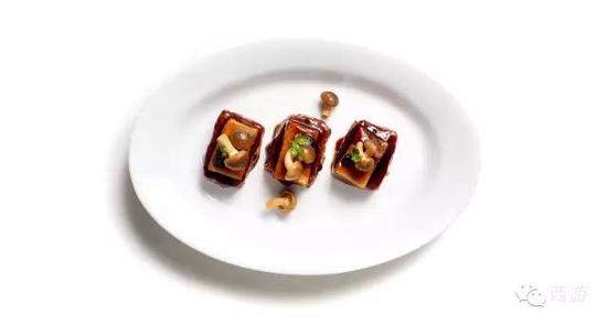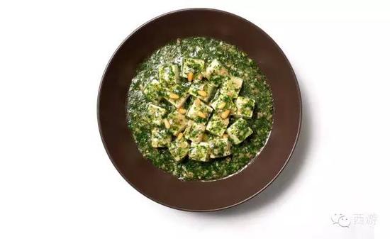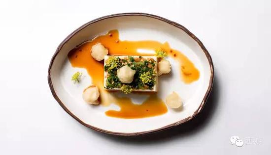 名厨Jean-Georges Vongerichten手中的绢豆腐呈现出他经典的酸香味来,掌勺的女主厨Bina赋予了它柠檬汁的活力酸味和酱油的醇和滋味。莳萝、莳萝花、松子、芝麻则给豆腐带来了更多种味道的变化,清爽之中富有多变的层次和回味。
