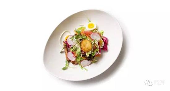 这道色拉中的鸡蛋豆腐上过粉后油炸,与低温慢煮的五花肉搭配,再加入蔬菜、西柚和溏心鹌鹑蛋,淋上由黄柠檬汁、浓缩糖汁及米醋打出的酱汁,口感有嫩有脆,滋味甘甜酸鲜,十分刺激开胃,很适合夏天。