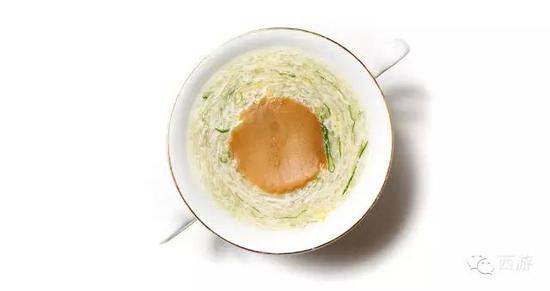 豆腐由于其软嫩的特性,通常变不出造型。不过在淮扬菜大师的手中,豆腐可以展现其细如发丝般的形态。碗中的这一丝丝豆腐是纯手切的,刀功之厉害令人叹为观止。豆腐丝和蛋皮丝、菜丝有个“福禄寿”的好口彩。而柔韧爽口的鲍鱼脯除了平添一份贵气外,更是带来另一种口感的对比。