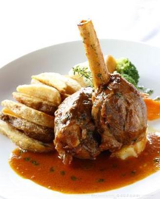 番茄汁烧羊膝骨配土豆泥:番茄酱、橙皮、牛骨汁、玉桂枝(香料)、香叶、盐、胡椒,需慢炖2小时。