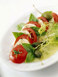 素材:3颗椭圆形的番茄、200克鲜奶酪(Mozzarella di bufala最佳)、20片罗勒叶、粗盐少许、黑胡椒少许、特纯橄榄油少许。