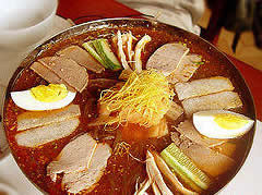 做法:牛肉整块烫煮2分钟后,捞出洗净。4杯水加煮肉料煮滚,放下肉块煮40分钟。取出肉块,待冷后切成薄片;牛肉汤过滤后放凉,如有浮油需撇除干净,分盛入面碗中;水滚后,放下细面煮熟,捞出沥干,再以冷开水冲凉,放入面碗的清汤中。面上再放泡菜丝、水梨片、蛋皮丝、牛肉片、炸过的松子和香菜段。