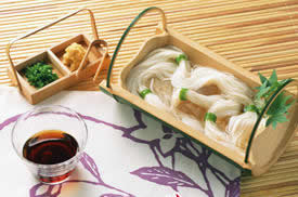 做法:汤锅中水煮开后,放下荞麦面,水开后加二次水煮至熟,捞出立刻冲冷水至凉(可在水中加放冰块),沥干后放在竹帘的盘子上,撒上少许海苔丝;柴鱼高汤加二倍水稀释后,盛装小碗中,另外将一小撮切得很细的葱花和山葵酱一起与凉面上桌。