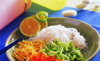 做法:面条用开水煮熟后捞出,放在大盘子上,加色拉油和麻油各1汤匙拌匀,用风扇吹凉;绿豆芽用开水烫熟,捞出冲冷后挤干,放在盘底。上面放凉面,再将鸡丝铺放在面条上(鸡胸肉煮熟,放冷后切丝);碗中先将芝麻酱加水调稀,再加上各种调味料调匀,浇到面上再撒下葱花及剁碎之五香花生米屑便可上桌。