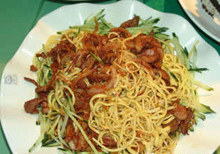 鸡丝凉面,就是在凉面上淋上用辣椒面、花椒油、醋、味精、酱油、蒜泥和麻油调成的味汁,再撒上煮熟后撕成的鸡丝。后来,人们又发展出绿豆芽凉面——绿豆芽在沸水中煮到半熟,保持脆嫩,放碗中,上面盖上凉面,再浇上和鸡丝凉面相似的味汁;还有三丝凉面,就是将单调的鸡丝丰富为鸡丝、火腿丝和猪肉丝。