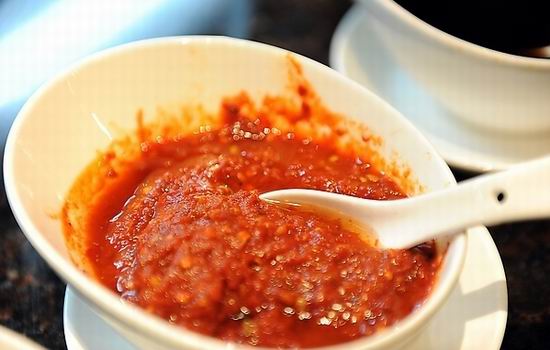 辣椒酱:红辣椒磨碎制成的酱,呈赤红色黏稠状,又称辣酱。可增添辣味,并增加菜肴色泽。