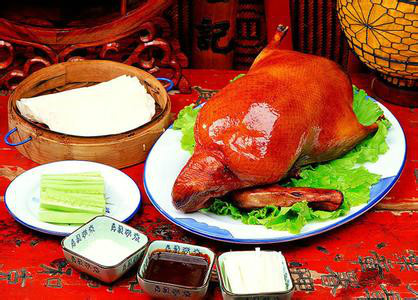北京烤鸭吸引食客的秘密,是其甜美而光泽鲜明的脆皮。人们将烤鸭在炉中慢慢翻转烘烤,烤出甜美多汁的脆皮,地道的食客会多吃皮,少吃肉,用小薄饼卷上,再配以葱段和海鲜酱或甜面酱,令人爱不释口。